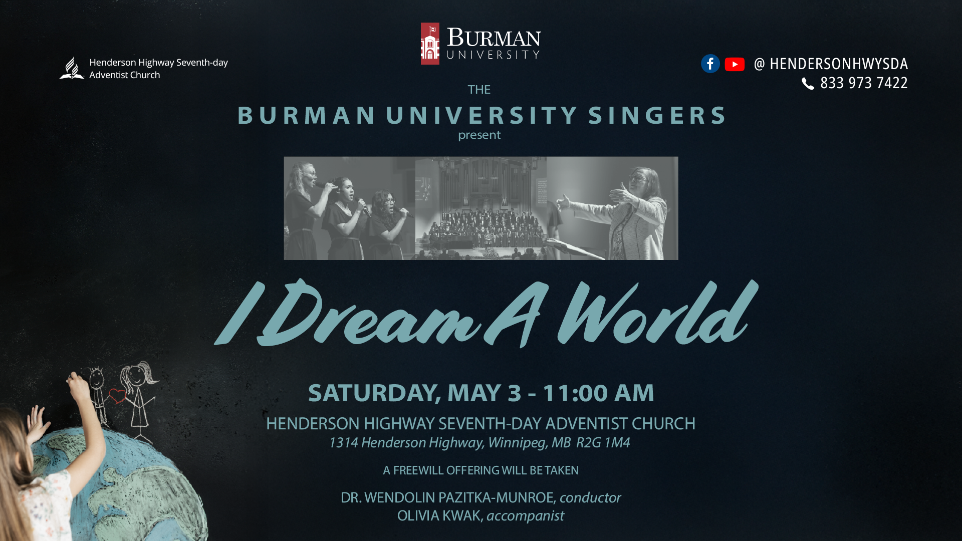 We welcome the Burman University Singers for worship on Saturday, May 3 at 11 am.